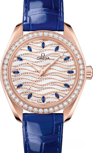 Женские часы Seamaster Aqua Terra являют собой образец истинной элегантности. Симметричный корпус этой модели диаметром 34 мм выполнен из розового золота 18к. На серебристом гильошированном циферблате с белыми бриллиантами и 12-ю синими сапфирами располагаются часовая, минутная и секундная стрелки. Эти часы, оснащенные Калибром Omega Co-Axial Master Chronometer 8800, сертифицированы Швейцарским федеральным институтом метрологии (METAS) в соответствии с высочайшими стандартами часовой индустрии. Они предлагаются с ремешком из кожи аллигатора с вставкой розового золота 18к. Безель из белых бриллиантов.