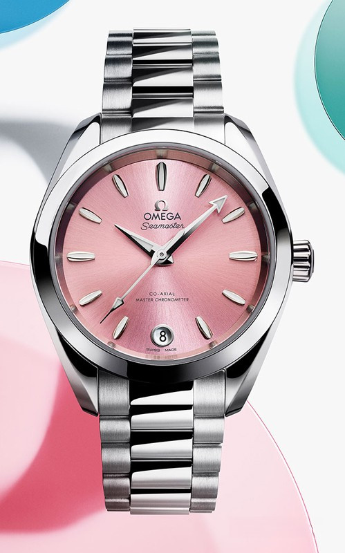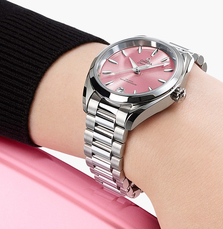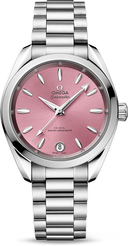 Женские часы Seamaster Aqua Terra являют собой образец истинной элегантности. Симметричный корпус этой модели диаметром 34 мм выполнен из нержавеющей стали. На розовом циферблате располагаются часовая, минутная и секундная стрелки, индикатор даты. Эти часы, оснащенные Калибром Omega Co-Axial Master Chronometer 8800, сертифицированы Швейцарским федеральным институтом метрологии (METAS) в соответствии с высочайшими стандартами часовой индустрии. Они предлагаются с браслетом из нержавеющей стали.