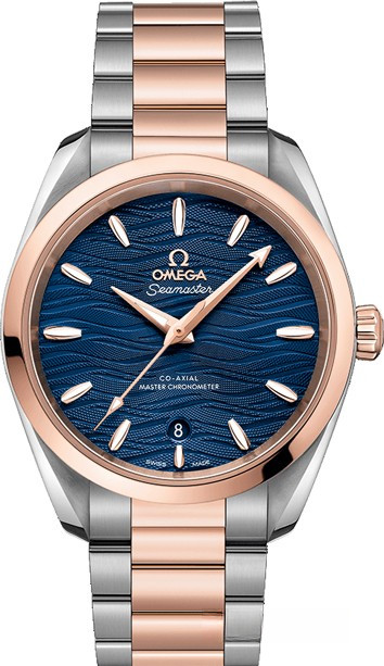Женские часы Seamaster Aqua Terra являют собой образец истинной элегантности. Симметричный корпус этой модели диаметром 38 мм выполнен из нержавеющей стали и розового золота 18к. На синем гильошированном циферблате отображаются часы, минуты, секунды и дата. Эти часы, оснащенные Калибром Omega Co-Axial Master Chronometer 8800, сертифицированы Швейцарским федеральным институтом метрологии (METAS) в соответствии с высочайшими стандартами часовой индустрии. Они предлагаются с браслетом из нержавеющей стали и розового золота 18к.