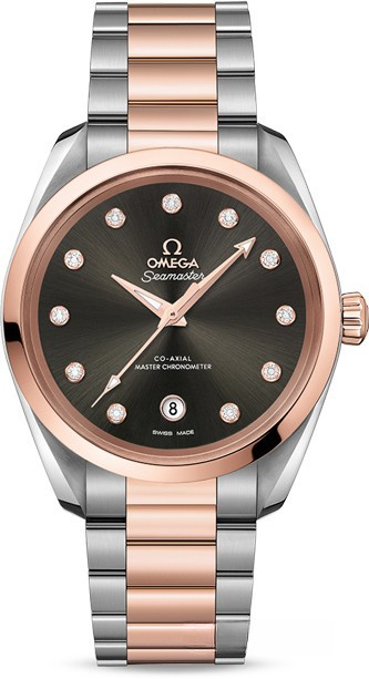 Женские часы Seamaster Aqua Terra в обрамлении из бриллиантов являют собой образец истинной элегантности. Симметричный корпус этой модели диаметром 38 мм выполнен из нержавеющей стали и розового золота 18к. На черном циферблате располагаются окошко указателя даты в положении "6 часов" и 11 бриллиантовых индексов в оправе с родиевым покрытием. Эти часы, оснащенные Калибром Omega Co-Axial Master Chronometer 8800, сертифицированы Швейцарским федеральным институтом метрологии (METAS) в соответствии с высочайшими стандартами часовой индустрии. Они предлагаются с интегрированным браслетом из нержавеющей стали и розового золота 18к.