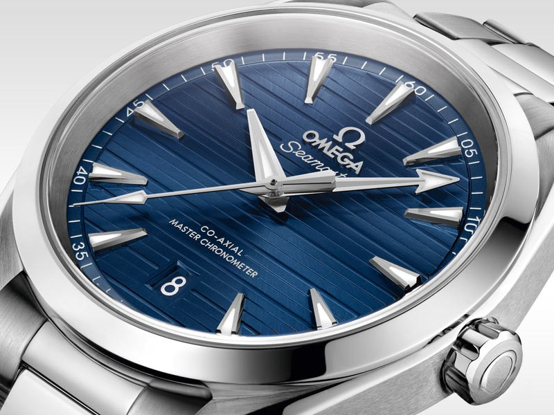 Корпус новых часов Aqua Terra изготовлен в нержавеющей стали. Окошко указателя даты было смещено с отметки "3 часа" в положение "6 часов". Циферблат новых часов Aqua Terra 150 м отличается чистотой и лаконичностью: специалисты Omega убрали с него надпись "water-resistance" и поместили ее в виде гравировки на заднюю крышку. Новая заводная головка конической формы дополняет эффектный облик, вдохновленный дизайном задней крышки с волнообразным краем. Главной особенностью часов Aqua Terra 150 м является специфическая отделка циферблата, напоминающая тиковое покрытие роскошных яхт. В отличие от предыдущих моделей, циферблат новых версий украшает узор, который образуется не из вертикальных, а из горизонтальных линий. Задняя крышка с ячейками украшена волнообразным мотивом. Сквозь заднюю крышку из сапфирового стекла можно наблюдать за безупречной работой часового механизма Omega Master Chronometer, калибр 8800.