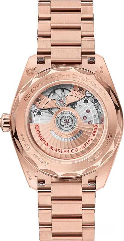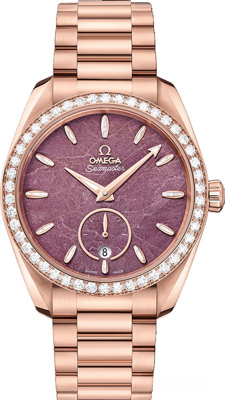 Часы Omega Seamaster Aqua Terra Small Seconds представлены в корпусе из розового золота 18к размером 38 х 19 мм водонепроницаемостью 150 метров. Внутри корпуса находится автоматический механизм, Калибр Omega 8802, обладающий запасом хода 55 часов. На розовом циферблате отображаются часы, минуты, секунды, дата. Часы поставляются на браслете из розового золота 18к. Безель из белых бриллиантов.