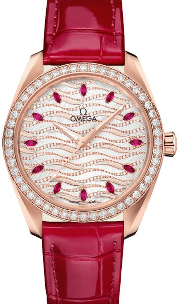 Женские часы Seamaster Aqua Terra в обрамлении из бриллиантов являют собой образец истинной элегантности. Симметричный корпус этой модели диаметром 38 мм выполнен из розового золота 18к. На белом жемчужном циферблате с белыми бриллиантами и красными рубинами отображаются часы, минуты и секунды. Эти часы, оснащенные Калибром Omega Co-Axial Master Chronometer 8800, сертифицированы Швейцарским федеральным институтом метрологии (METAS) в соответствии с высочайшими стандартами часовой индустрии. Они предлагаются с ремешком из кожи аллигатора с вставкой из розового золота 18к. Безель из белых бриллиантов.