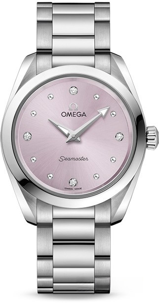 Женские часы Seamaster Aqua Terra являют собой образец истинной элегантности. Симметричный корпус этой модели диаметром 28 мм выполнен из нержавеющей стали. На сиреневом циферблате располагаются 8 индексов в виде точек с родиевым покрытием и 4 бриллиантовых индекса в оправе с родиевым покрытием. Дизайн дополняют стрелки с родиевым покрытием и задняя крышка с тисненым изображением морского конька Omega на фоне волн. Часы, оснащенные Калибром Omega 4061, предлагаются с интегрированным браслетом из нержавеющей стали.