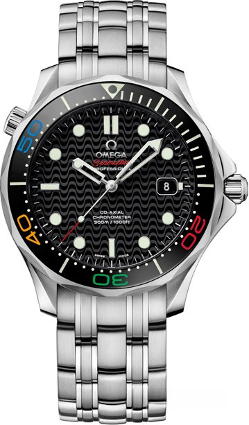Уникальные часы OMEGA Seamaster Diver 300M воздают должное бренду, который является официальным хронометристом Олимпийских игр 2016 в Рио-де-Жанейро. Черный циферблат украшен волнистым узором, нанесенным переводным способом. Источником вдохновения для его создания послужили дорожки пляжа Копакабана. На черный полированный керамический безель нанесена дайверская шкала, заполненная белым люминесцентным составом Super-LumiNova, а также цифры, покрытые лаком красного, синего, желтого и зеленого цветов, символизирующих цвета олимпийских колец. Окошко даты, как обычно в моделях Seamaster Diver 300M, находится в положении "3 часа", гелиевый клапан – в положении "10 часов". Циферблат оформлен полированными скелетонизированными часовой и минутной стрелками граненой формы. Корпус диаметром 41 мм выполнен из нержавеющей стали. На обратной стороне можно увидеть логотип Олимпийских игр "Rio 2016" и выгравированный номер лимитированной серии. Часы оснащает коаксиальный часовой механизм OMEGA 2500.