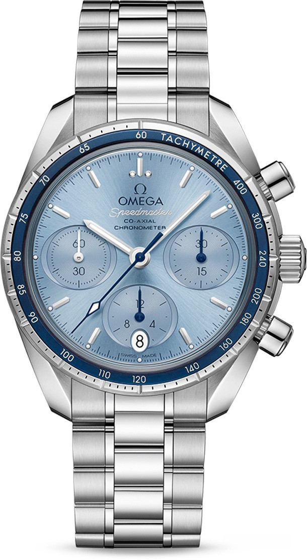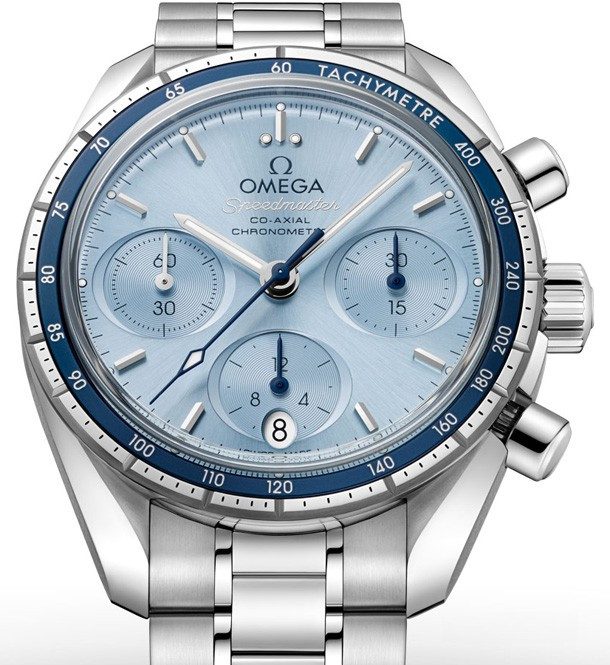 Omega Speedmaster 38 mm оснащены изящным циферблатом голубого цвета и дополнены браслетом из нержавеющей стали. Часы Speedmaster диаметром 38 мм примечательны тем, что на их циферблате можно увидеть горизонтальные овальные счетчики и вертикальное овальное окошко указателя даты в положении "6 часов". Источником вдохновения для этого дизайна послужили часы Omega De Ville, некоторые модели которых также имели овальные счетчики. "Заднюю крышку всех моделей украшает традиционный для часов Speedmaster медальон с легендарным рельефным изображением морского конька". Часы оснащены надежным и высококачественным механизмом Omega, калибр 3330.