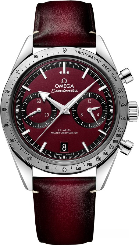 Часы 57 Co-Axial Master Chronometer Chronograph 40.5 mm представлены в корпусе из нержавеющей стали размером 40.5 мм водонепроницаемостью 50 метров. Внутри корпуса установлен автоматический механизм, Калибр 9906, обладающий запасом хода 60 часов. На бордовом циферблате отображаются часы, минуты, секунды, дата, накопители хронографа, тахиметр. Часы поставляются на кожаном ремешке с застежкой из нержавеющей стали.