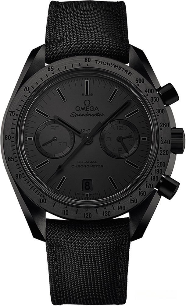 Эксцентричная модель Omega Speedmaster Dark Side Of The Moon Black Black имеет черный корпус, черный матовый керамический циферблат, выполненный методом лазерной обработки, черненные индексы и две черные точки на цифре 12, на которые нанесено люминесцентное покрытие Super-LumiNova. Часы оснащены Калибром Omega Co-Axial 9300, секундный счетчик находится в положении 9 часов, а 30-минутный и 12-часовой счетчики совмещены в положении 3 часа, - Master Co-Axial, то есть, антимагнитный до 15000 Гс оригинальный корпус 44.25 мм в диаметре и толщиной 16,14 мм из черной керамики (ZrO2), а также оригинальная керамическая застежка Omega Speedmaster Dark Side Of the Moon.