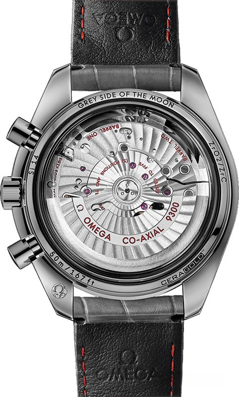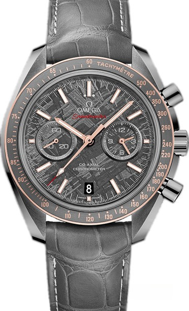 Вдохновленные лунной пылью, мастера создали часы из белой керамики, превратив её цвет в серый мерцающий металлик. Материал 44.25 миллиметрового корпуса поддается термообработке в камерах плазменного нагрева при температуре 20 000 °C и под воздействием различных газов приобретает серый цвет. Корпус, его задняя часть, безель, заводная головка, кнопки и застежка – всё выполнено из одного керамического материала. Другой отличительной чертой модели Speedmaster “Grey Side of the Moon Meteorite” является тахометрическая шкала, Super-LumiNova на роскошном керамическом безеле – очередной эксклюзив от Omega. Метки и маркеры на безеле выгравированы и заполнены по технологии Super-LumiNova так, что теперь возможно отслеживать показания тахометра при любом освещении. Метеоритный циферблат с пескоструйной обработкой предоставляет часам Speedmaster сногсшибательный вид и передает всё мастерство, с которым они созданы. 12-часовой и 60-минутный счетчики находится на субциферблате в позиции 3 часов и секундомер возле отметки в 9 часов. Часы комплектуются ремешком из кожи аллигатора.