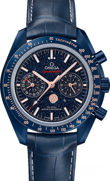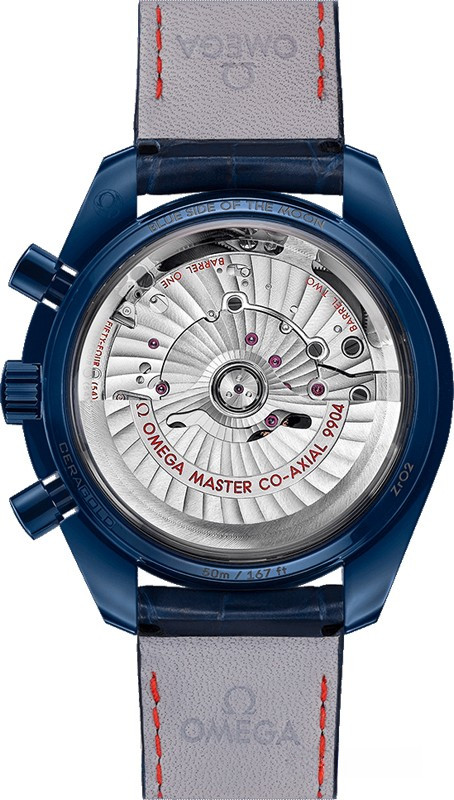 Материал 44.25-миллиметрового корпуса поддается термообработке в камерах плазменного нагрева при температуре 20 000 °C. Корпус, его задняя часть, безель, заводная головка, кнопки и застежка – всё выполнено из одного керамического материала. Другой отличительной чертой модели Speedmaster Blue Side of the Moon” является тахометрическая шкала, Super-LumiNova на роскошном керамическом безеле – очередной эксклюзив от Omega. Метки и маркеры на безеле выгравированы и заполнены по технологии Super-LumiNova так, что теперь возможно отслеживать показания тахометра при любом освещении. На синем циферблате расположены 12-часовой и 60-минутный счетчики, а также секундомер. Часы комплектуются синим ремешком из кожи аллигатора с титановой застежкой.