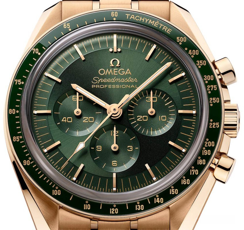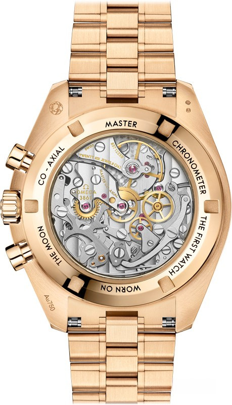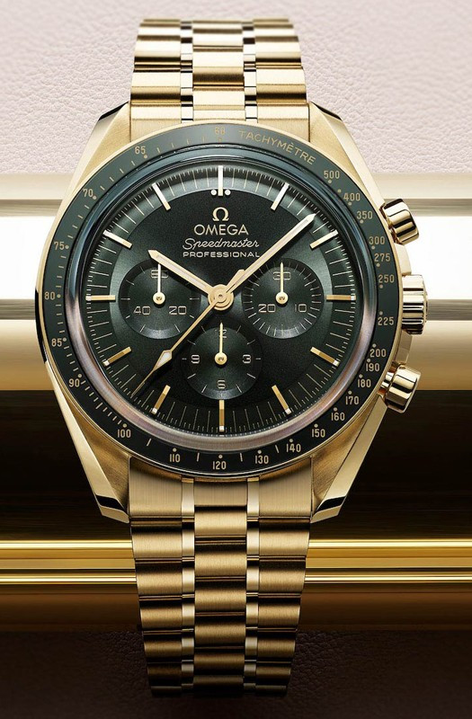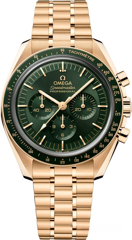 Часы Omega Speedmaster Mmoonwatch Professional Co-Axial Master Chronometer Chronograph 42 mm представлены в корпусе из желтого золота 18к размером 42 мм водонепроницаемостью 50 метров. Внутри корпуса установлен механизм с ручным заводом, Калибр 3861, обладающий запасом хода 50 часов. На зеленом циферблате отображаются часы, минуты, секунды, тахиметр. Часы поставляются на браслете из желтого золота 18к.