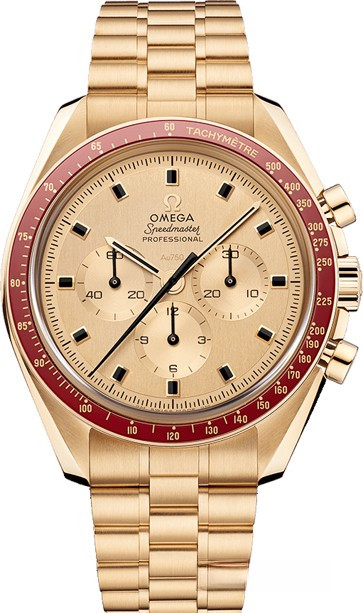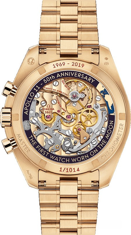 В честь золотого юбилея часов OMEGA, которые получили в подарок астронавты, совершившие первую в истории посадку на Луну, компания OMEGA выпустила эту модель Speedmaster ограниченной серией из 1014 экземпляров. Часы оснащены механизмом OMEGA Master Chronometer 3861 с ручным заводом. При создании памятной модели было использовано 18-каратное золото Moonshine™. На циферблате с вертикальным сатинированием, также выполненном из 18-каратного золота Moonshine™, располагаются часовые индексы граненой формы из оникса. Источником вдохновения при создании этих часов послужила модель 1969 года. Новый Speedmaster привлекает внимание керамическим безелем, отметками на задней крышке и механизмом. Декоративное внутреннее кольцо задней крышки, выполненное из 18-каратного золота Moonshine™ с использованием отделки черного цвета, украшено картой с изображением американского континента, а также выпуклой вставкой из лунного метеорита, отражающей истинные пропорции Земли и Луны.