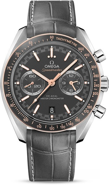 Модель Speedmaster Racing Master Chronometer в корпусе диаметром 44,25 мм из нержавеющей стали с безелем из 18-каратного золота Sedna™ предлагается с серым кожаным ремешком. Нитрид-кремниевый безель оформлен знаменитой тахиметрической шкалой из материала OMEGA Ceragold™. На матовом сером циферблате представлена характерная минутная шкала, напоминающая спидометр гоночных автомобилей, благодаря которой часы получили свое название. Оформление также дополняют два счетчика с покрытыми родием накладными кольцами и размещенное в положении "6 часов" окошко указателя даты, гармонирующее по цвету с циферблатом. На индексы в форме стрелы, часовую и минутную стрелки из 18-каратного золота Sedna™ нанесено белое люминесцентное покрытие Super-LumiNova. Часы оснащены калибром OMEGA Co-Axial Master Chronometer 9900, сертифицированным Швейцарским федеральным институтом метрологии (METAS) в соответствии с самыми строгими стандартами в часовой индустрии.