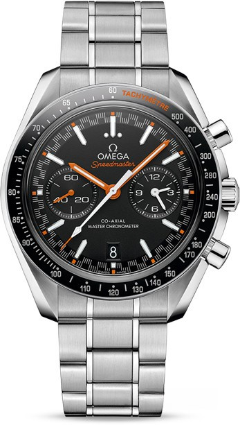 Модель Speedmaster Racing Master Chronometer с корпусом диаметром 44,25 мм и браслетом из нержавеющей стали оформлена черным керамическим кольцом безеля со знаменитой тахиметрической шкалой, в которой оранжевая надпись сочетается с цифрами из материала Liquidmetal®. На матовый черный циферблат нанесена характерная минутная шкала, напоминающая спидометр гоночных автомобилей, благодаря которой часы получили свое название. Оформление также дополняют два счетчика с чернеными накладными кольцами и размещенное в положении "6 часов" окошко указателя даты, гармонирующее по цвету с циферблатом. Покрытые оранжевым и белым лаком стрелки сочетаются с индексами в форме стрелы из 18-каратного белого золота с белым люминесцентным покрытием Super-LumiNova. Часы оснащены калибром OMEGA Co-Axial Master Chronometer 9900, сертифицированным Швейцарским федеральным институтом метрологии (METAS) в соответствии с самыми строгими стандартами в часовой индустрии.