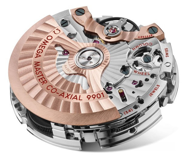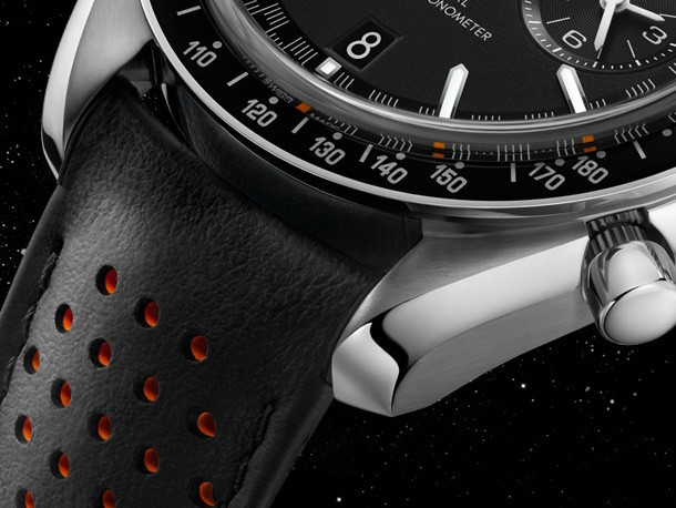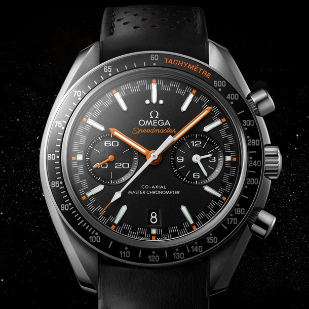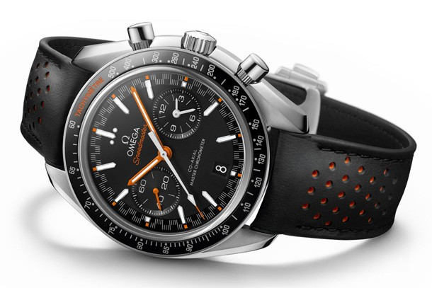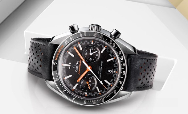 К циферблату хронометра Speedmaster Racing Master Chronometer внимание привлекает характерная минутная шкала, напоминающая спидометр гоночных автомобилей. Оригинальная минутная шкала на циферблате навеяна темой автоспорта, отсюда и название самой модели. Среди других особенностей циферблата – индексы в форме стрел со скошенными краями и люминесцентным покрытием Super-LumiNova, а также несколько увеличенные счетчики. Модель в корпусе диаметром 44,25 мм выполнена из нержавеющей стали. Безель часов изготовлен из полированной керамики. Применение новой технологии обработки сапфирового стекла позволило сделать часы визуально более плоскими. Часы дополнены черным кожаным ремешком с подкладкой из каучука оранжевого цвета по центру. Микроотверстия на ремешке, демонстрирующие внутреннюю вставку из оранжевого каучука, были сделаны с помощью фрезерного инструмента. Механизм, которым оснащены часы, отличается превосходной точностью и является одним из самых тонких калибров Omega. Благодаря калибру 9900/9901 часы и их механизм отвечают высочайшему стандарту Швейцарской индустрии в области точности, стабильности хода и устойчивости к воздействию магнитных полей, что подтверждено соответствующим сертификатом Швейцарского федерального института метрологии (METAS).