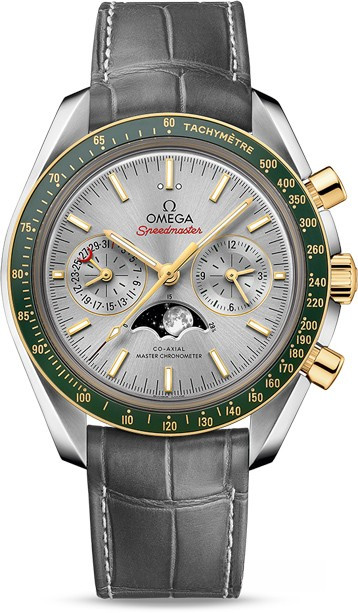 Часы Speedmaster, одно из самых знаменитых творений OMEGA, участвовали во всех шести успешных пилотируемых миссиях на Луну. Новым воплощением исследовательского духа OMEGA стала модель Moonphase с двумя миниатюрными и в то же время крайне реалистичными изображениями Луны. Часы диаметром 44,25 мм оснащены серым циферблатом с радиальным сатинированием и полированными стрелками и индексами из 18-каратного желтого золота. В положении "6 часов" размещен точный указатель фаз Луны: лунный диск из металлизированного хрусталя с микроструктурой детально передает облик естественного спутника Земли. Корпус из нержавеющей стали и 18-каратного желтого золота дополнен зеленым керамическим безелем с тахиметрической шкалой из материала Ceragold™ и серым кожаным ремешком с полированной и сатинированной раскладывающейся застежкой. Сердцем часов является механизм OMEGA Co-Axial Master Chronometer 9904, имеющий официальный сертификат METAS.