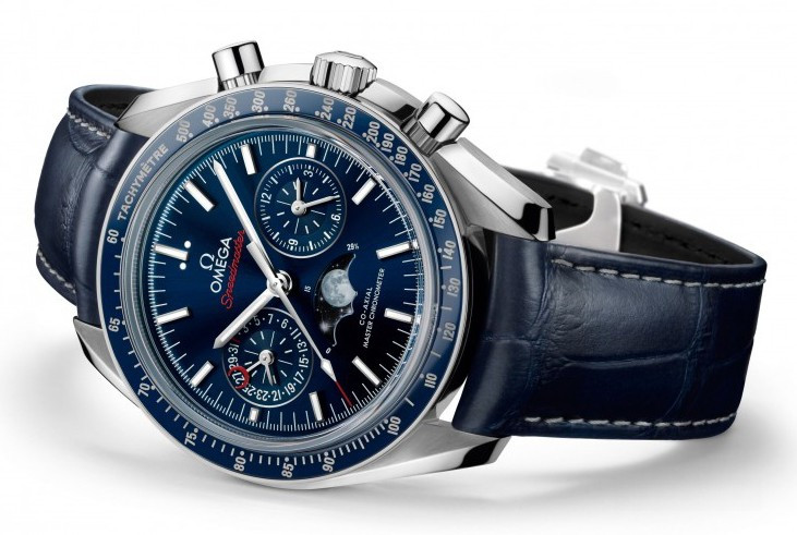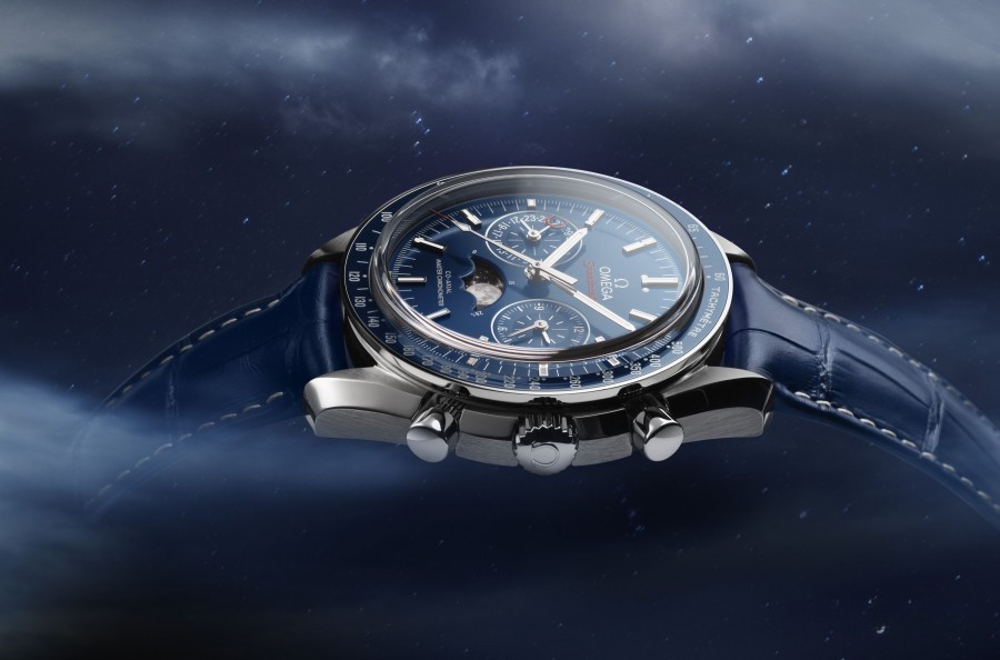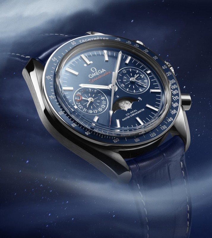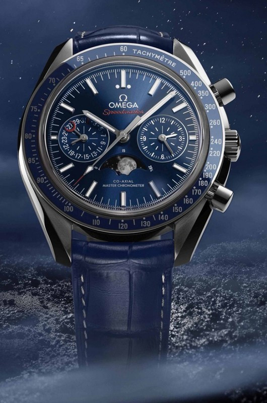 Круглый корпус новинки, изготовленный из нержавеющей стали, диаметром 44,25 мм, толщиной 16,85 мм, водонепроницаемый до 100 метров. На торце защищенной завинчивающейся рифленой заводной головки, расположенной на 3 часах, выгравирован логотип бренда Omega. Пушеры хронографа размещены на 2 и 4 часах. Фиксированный керамический круглый безель синего цвета с тахиметрической шкалой, выполненной из сплава Liquidmetal. Сапфировое стекло установлено на передней стороне часового корпуса (с двусторонним антибликовым покрытием) и на его завинчивающейся задней крышке (с внутренним антибликовым покрытием). Циферблат синего цвета с лучистой отделкой, с накладными продолговатыми индексами, покрытыми, как и часовая и минутная стрелки, люминесцентным составом белого цвета. Модель оснащена мануфактурным швейцарским автоматическим механизмом 9904, с функциями индикации часов, минут (посредством соответствующих центральных стрелок), секунд (на соответствующем малом боковом циферблате, расположенном на 9 часах), даты (посредством соответствующего круглого аналогового указателя со стрелкой с красным полукруглым наконечником, расположенным на 9 часах), фаз Луны (посредством соответствующего указателя с реалистичным изображением лунного диска, расположенного на 6 часах), а также с хронографом (центральная секундная стрелка с красным наконечником, совмещенные круглые аналоговые 30-минутный и 12-часовый счетчики, расположенные на 3 часах). Часы сертифицированы в качестве "Master Chronometer" Федеральным институтом метрологии (METAS). Это тестирование предусматривает исследование часов на герметичность, магнитоустойчивость и точность хода в различных положениях и в условиях разных температур. Поставляется на синем ремешке из кожи аллигатора с голубой прошивкой и с застежкой из нержавеющей стали.