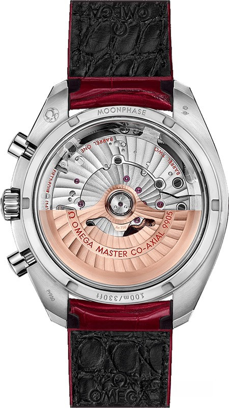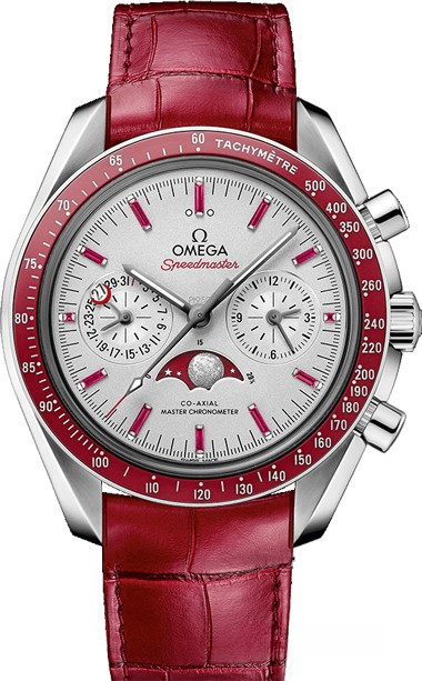 Часы Speedmaster, одно из самых знаменитых творений OMEGA, участвовали во всех шести успешных пилотируемых миссиях на Луну. В честь этой славной страницы их истории создана модель Moonphase, сочетающая классический дизайн Speedmaster с изысканными материалами и точностью хода. Ее корпус диаметром 44,25 мм изготовлен из платины и золота, на красный фланец безеля из оксида алюминия нанесена тахиметрическая шкала из матовой платины Liquidmetal™. На циферблате из платины и золота, подвергнутом пескоструйной обработке, ярко выделяются индексы из 18-каратного белого золота с рубинами багетной огранки. С ними превосходно сочетается диск фазы Луны из оксида алюминия красного цвета с двумя изображениями Луны из платины Liquidmetal™, размещенный в положении "6 часов". Циферблат также снабжен увеличенной стрелкой индикатора даты и чернеными часовой, минутной и центральной секундной стрелками с белым люминесцентным покрытием Super-LumiNova. Часы на кожаном ремешке красного цвета оснащены механизмом OMEGA Master Chronometer 9905, который был испытан на соответствие высочайшим стандартам качества и сертифицирован Швейцарским федеральным институтом метрологии (METAS).