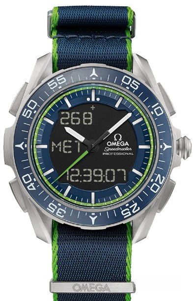 Модель Speedmaster Skywalker X-33 Solar Impulse Limited Edition – это не просто яркие часы: они посвящены проекту, главная цель которого – облететь вокруг Земли на самолете, приводимом в движение исключительно солнечной энергией. В центре аналогового сине-зеленого циферблата с белыми индексами и часовыми метками, нанесенными переводным способом и покрытыми белым люминесцентным составом Super-LumiNova, находится жидкокристаллический цифровой дисплей. Часы Speedmaster Skywalker X-33 Solar Impulse Limited Edition из титана 2 оснащены многофункциональным кварцевым часовым механизмом с хронографом OMEGA, калибр 5619. На их задней крышке из титана Grade 2 выштампованы эмблема Solar Impulse «Around the World», название модели и надпись «TESTED AND QUALIFIED BY ESA» (ESA – Европейское космическое агентство). Выпускаемая ограниченной серией из 1924 экземпляров модель дополнена ремешком NATO из полиамида синего цвета с зеленой окантовкой.