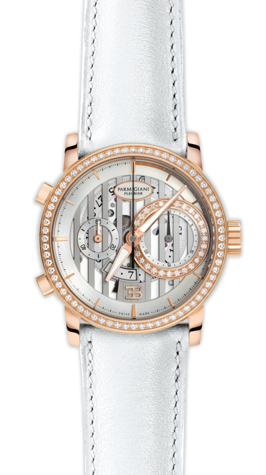 Часы Parmigiani Fleurier Bugatti Atalante представлены в корпусе из розового золота 18к диаметром 43 мм. Внутри корпуса находится автоматический механизм с функцией хронографа, Калибр PF 335. На серебристом с золотистым циферблате, инкрустированным белыми бриллиантами, отображаются часы, минуты, секунды, дата, тахиметр. Часы комплектуются белым кожаным ремешком с вставкой из розового золота 18к. Водонепроницаемость составляет 30 метров. Безель из белых бриллиантов.