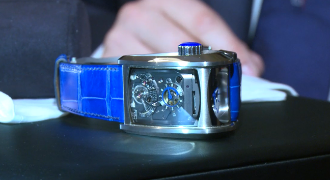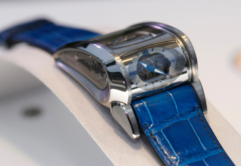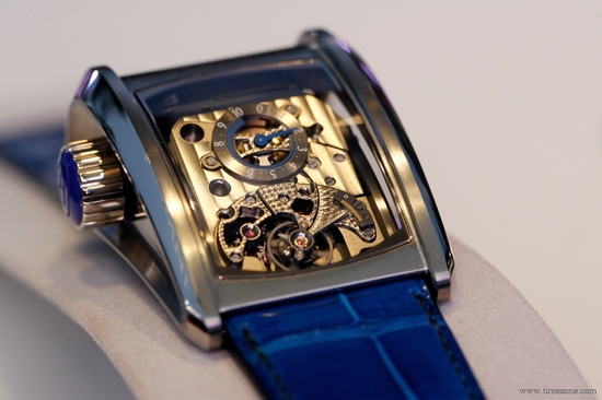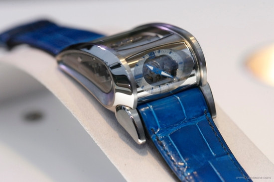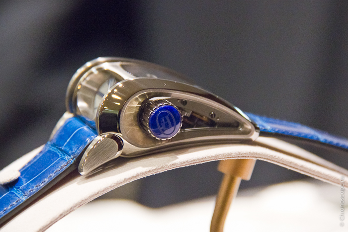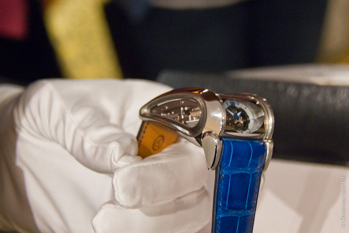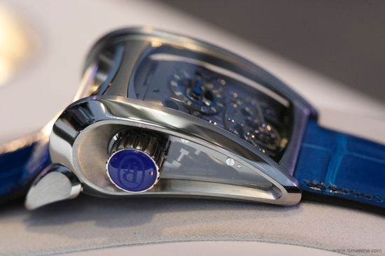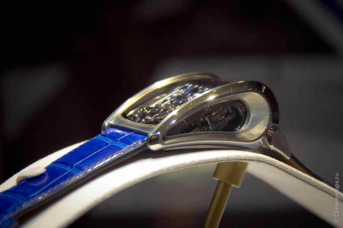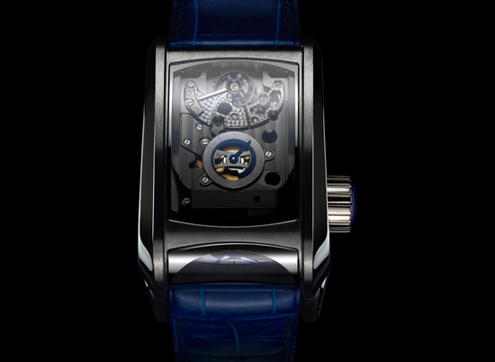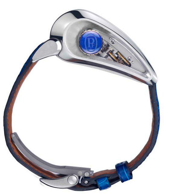 Часы Parmigiani Fleurier Bugatti Vitesse представлены в корпусе из титана размером 36 х 50.7 х 22.7 мм. Внутри корпуса находится механизм с ручным заводом, Калибр PF 372, обладающий запасом хода 10 дней. На серебристом циферблате отображаются часы, минуты, запас хода. Часы комплектуются синим ремешком из кожи аллигатора с титановой вставкой. Водонепроницаемость составляет 10 метров.