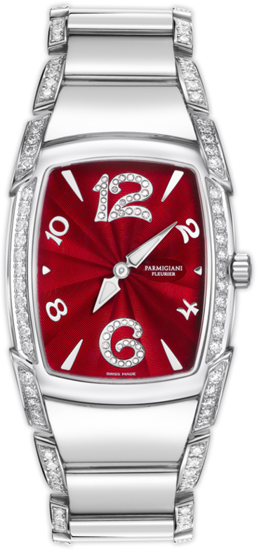 Часы Parmigiani Fleurier Kalpa Donna представлены в корпусе из нержавеющей стали размером 34.8 х 24.8 х 6.8 мм. Внутри корпуса находится кварцевый механизм, Калибр PF600. На красном гильошированном циферблате, инкрустированном белыми бриллиантами, отображаются часы, минуты. Часы комплектуются браслетом из нержавеющей стали, инкрустированном белыми бриллиантами. Водонепроницаемость составляет 30 метров. Корпус инкрустирован белыми бриллиантами.