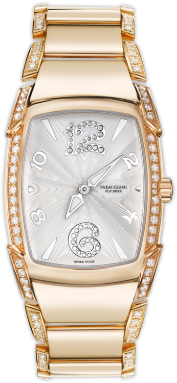 кЧасы Parmigiani Fleurier Kalpa Donna представлены в корпусе из розового золота размером 34.8 х 24.8 х 6.8 мм. Внутри корпуса находится кварцевый механизм, Калибр PF600. На серебристом гильошированном циферблате, инкрустированном белыми бриллиантами, отображаются часы, минуты. Часы комплектуются браслетом из розового золота 18к, инкрустированным белами бриллиантами. Водонепроницаемость составляет 30 метров. Корпус инкрустирован белыми бриллиантами.