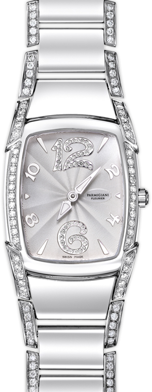 Часы Parmigiani Fleurier Kalpa Piccola представлены в корпусе из нержавеющей стали размером 29.5 х 24.5 мм. Внутри корпуса находится кварцевый механизм, Калибр PF600. На серебристом гильошированном циферблате с белыми бриллиантами отображаются часы, минуты. Часы комплектуются браслетом из нержавеющей стали, инкрустированным белыми бриллиантами. Водонепроницаемость составляет 30 метров. Корпус инкрустирован белыми бриллиантами.