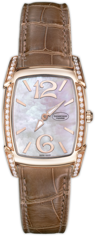 Часы Parmigiani Fleurier Kalpa Piccola представлены в корпусе из розового золота 18к размером 29.5 х 24.5 мм. Внутри корпуса находится кварцевый механизм, Калибр PF600. На белом жемчужном циферблате отображаются часы, минуты. Часы комплектуются коричневым ремешком из кожи аллигатора с вставкой из розового золота 18к. Водонепроницаемость составляет 30 метров. Корпус инкрустирован белыми бриллиантами.