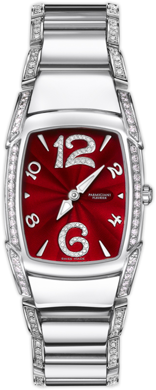 Часы Parmigiani Fleurier Kalpa Piccola представлены в корпусе из нержавеющей стали размером 29.5 х 24.5 мм. Внутри корпуса находится кварцевый механизм, Калибр PF600. На бордовом гильошированном циферблате с белыми бриллиантами отображаются часы, минуты. Часы комплектуются браслетом из нержавеющей стали, инкрустированным белыми бриллиантами. Водонепроницаемость составляет 30 метров. Корпус инкрустирован белыми бриллиантами.
