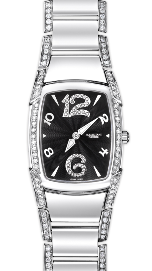 Часы Parmigiani Fleurier Kalpa Piccola представлены в корпусе из нержавеющей стали размером 29.5 х 24.5 мм. Внутри корпуса находится кварцевый механизм, Калибр PF600. На черном гильошированном циферблате с белыми бриллиантами отображаются часы, минуты. Часы комплектуются браслетом из нержавеющей стали, инкрустированным белыми бриллиантами. Водонепроницаемость составляет 30 метров. Корпус инкрустирован белыми бриллиантами.