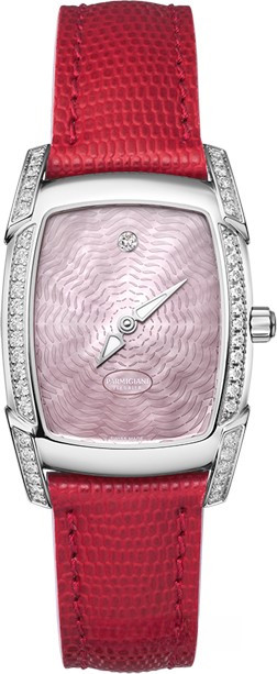 Часы Parmigiani Fleurier Kalpa Kalpa Piccola Anniversaire выпущены в корпусе из нержавеющей стали, размером 29.5 x 21.5 х 6.9 мм и водонепроницаемостью 30 м. Внутри корпуса установлен кварцевый механизм. На розовом жемчужном гильошированном циферблате отображаются часы, минуты. Часы комплектуются кожаным ремешком с вставкой из нержавеющей стали. Корпус инкрустирован белыми бриллиантами.