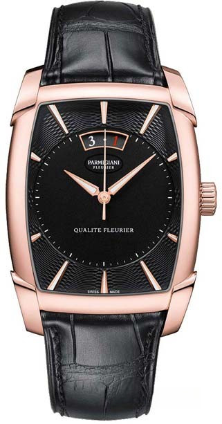 Часы Parmigiani Fleurier Kalpa Qualite Fleurier представлены в корпусе размером 42.3 х 32.1 х 10.1 мм из розового золота 18к с водонепроницаемостью до 30 метров. Внутри корпуса установлен механизм с ручным заводом, обладающий запасом хода 60 часов. На черном гильошированном циферблате отображаются часы, минуты, секунды, дата. Часы поставляются на ремешке из кожи аллигатора с вставкой из розового золота 18к.