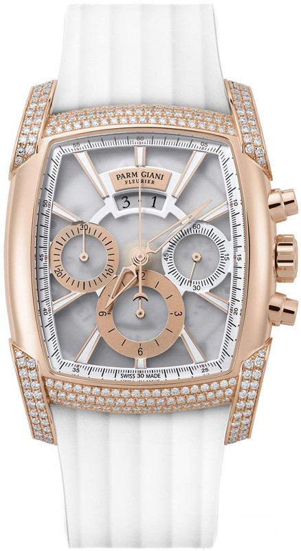 Часы Parmigiani Fleurier Kalpa Kslpagraph выпущены в корпусе из розового золота 18к, размером 44.5 x 39.2 х 12.8 мм и водонепроницаемостью 30 м. Внутри корпуса установлен автоматический Калибр PF334 с запасом хода 50 часов. На белом циферблате отображаются часы, минуты, секунды, дата, накопители хронографа. Часы комплектуются каучуковым ремешком с золотой застежкой. Корпус инкрустирован белыми бриллиантами.