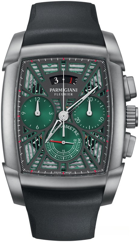 Часы Parmigiani Fleurier Kalpa Kslpagraph выпущены в корпусе из титана размером 44.5 x 39.2 х 12.8 мм и водонепроницаемостью 30 м. Внутри корпуса установлен автоматический Калибр PF334 с запасом хода 50 часов. На зеленом циферблате отображаются часы, минуты, секунды, дата, накопители хронографа. Часы комплектуются каучуковым ремешком с титановой застежкой.