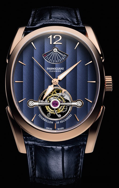 Корпус, состоящий из трёх частей и выполненный из розового золота, а также двухуровневый безель добавляют энергичности дизайну часов Ovale Tourbillon. Никаких круглых форм. Но и прямые линии неожиданно закруглены. Многочисленные углы создают игру света. Без внимания не оставлены и фирменные ушки. В них перетекает широкая кромка безеля, что придает дополнительную динамику корпусу. Овальный корпус этой модели имеет свой собственный брутальный стиль. Циферблат с классической отделкой «Côtes de Genève» насыщенно-синего цвета, секрет которого известен только мастерам Parmigiani Fleurier, придает модели еще больше строгого очарования. Традиционно каждый год Мануфактура выпускает новую модель в этом насыщенно-синем цвете, который позволяет каждому изделию выглядеть абсолютно уникально.