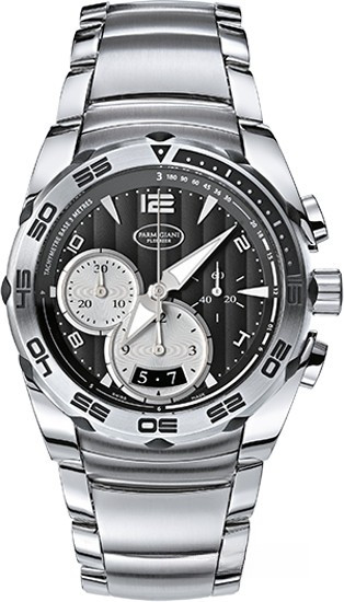 Часы Parmigiani Fleurier Pershing 002 выпущены в корпусе из нержавеющей стали размером 42 х 13.1мм и водонепроницаемостью 100 м. Внутри корпуса установлен автоматический Калибр PF334 с запасом хода 50 часов. На черном гильошированном с серебристым циферблате отображаются часы, минуты, секунды, дата, накопители хронографа. Часы комплектуются браслетом из нержавеющей стали.