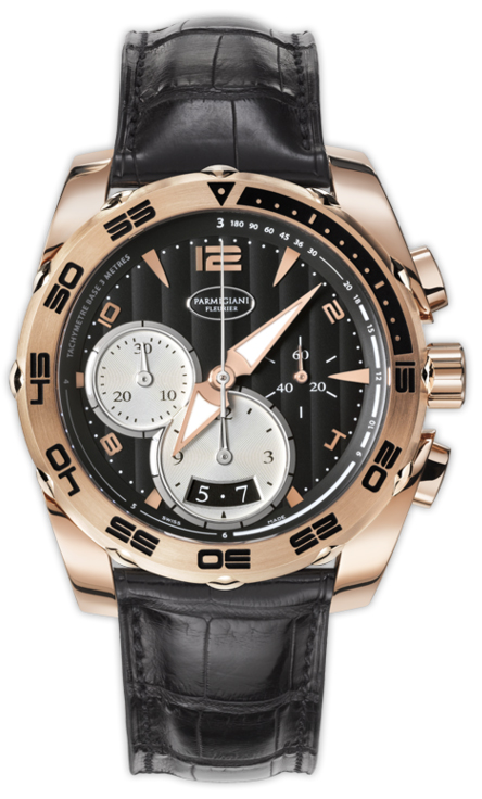 Часы Parmigiani Fleurier Pershing 002 с функцией хронографа представлены в корпусе из розового золота 18к диаметром 42 мм с вращающимся безелем. Внутри корпуса находится автоматический механизм, Калибр PF334. На черном с серебристым циферблате отображаются часы, минуты, секунды, дата, тахиметр. Часы комплектуются черным ремешком из кожи аллигатора с вставкой из розового золота 18к. Водонепроницаемость составляет 100 метров.