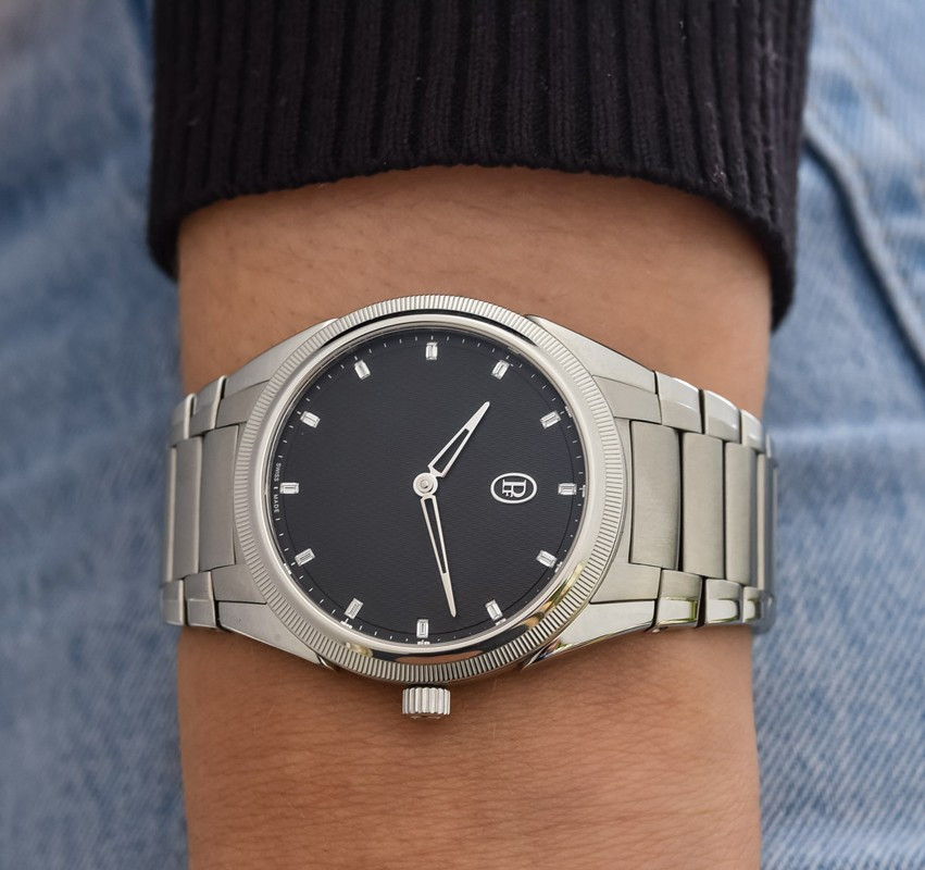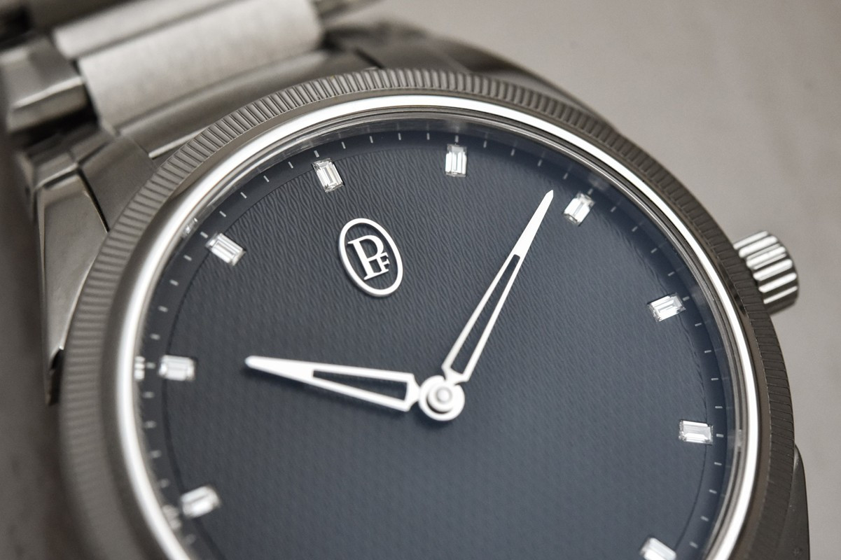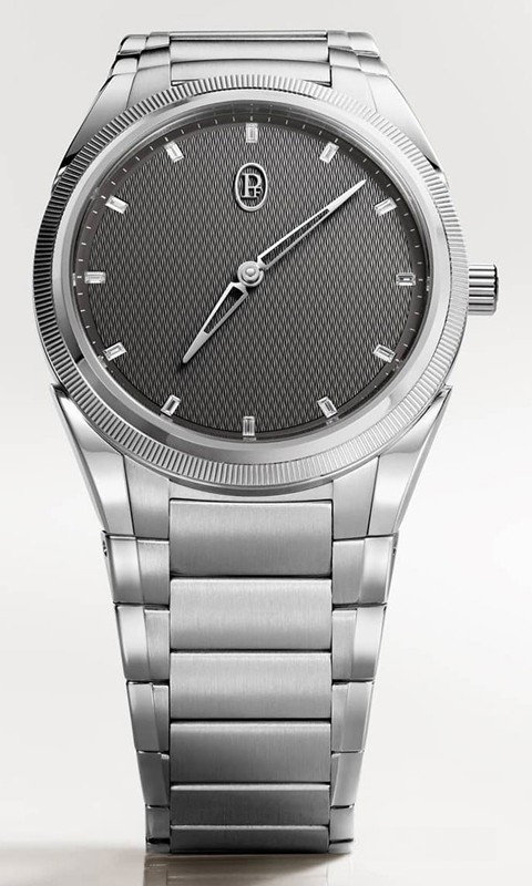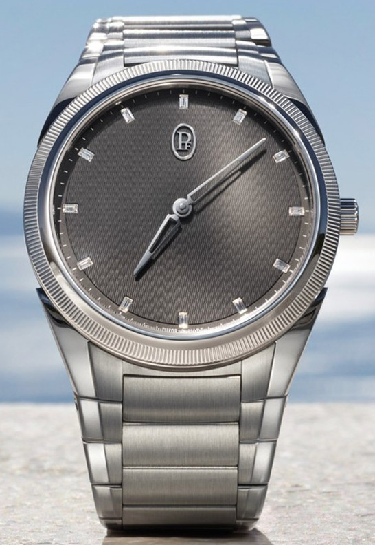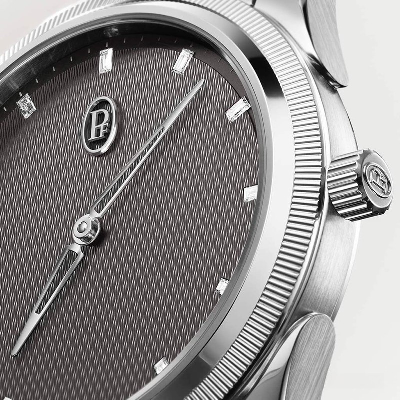 Часы Parmigiani Fleurier Tonda PF Automatic 36 представлены в корпусе размером 36 мм из нержавеющей стали водонепроницаемостью 100 метров. Внутри корпуса установлен автоматический механизм, Калибр PF770, обладающий запасом хода 60 часов. На сером гилошированном циферблате с 12-ю белыми бриллиантами отображаются часы, минуты. Часы поставляются на браслете из нержавеющей стали.