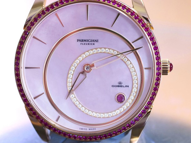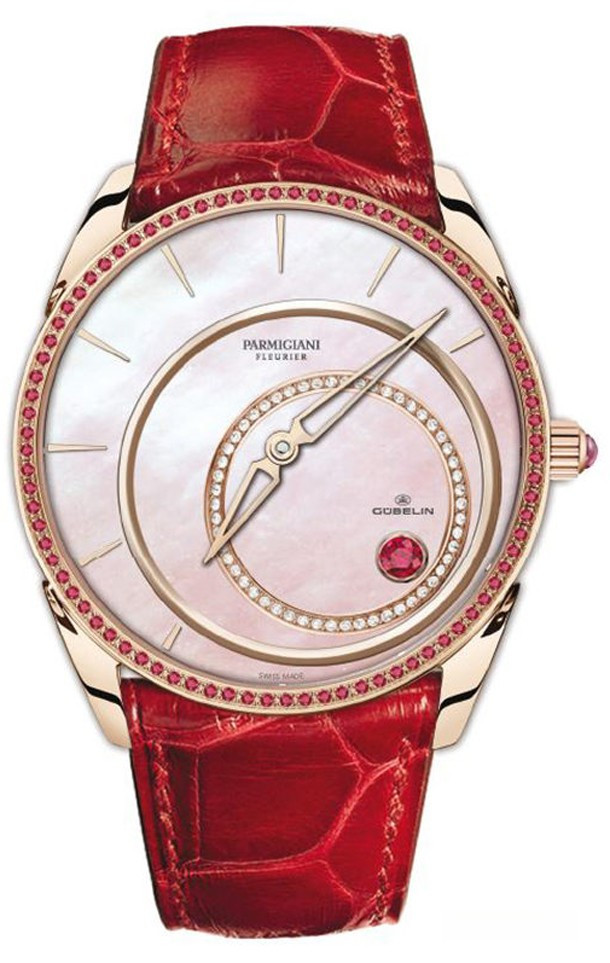 Часы Parmigiani Fleurier Tonda 1950 Gubelin Limited Edition представлены в корпусе из розового золота 18к размером 39 х 8.4 мм. Внутри корпуса установлен автоматический механизм, обладающий запасом хода 42 часа. На розовом жемчужном циферблате с белыми бриллиантами и красным рубином отображаются часы и минуты. Часы поставляются на ремешке из кожи аллигатора с вставкой из розового золота 18к. Водонепроницаемость корпуса составляет 30 метров. Безель из 84-х красных рубинов. Серия ограничена - 28 шт.
