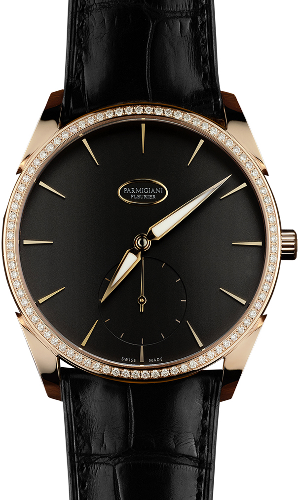 Часы Parmigiani Fleurier Tonda 1950 Set представлены в корпусе из розового золота 18к размером 39 х 7.8 мм. Внутри корпуса находится автоматический механизм, Калибр PF701. На черном циферблате отображаются часы, минуты, секунды. Часы комплектуются черным ремешком из кожи аллигатора с вставкой из розового золота 18к. Водонепроницаемость составляет 30 метров. Безель из 84-х белых бриллиантов весом 0.65 ct.