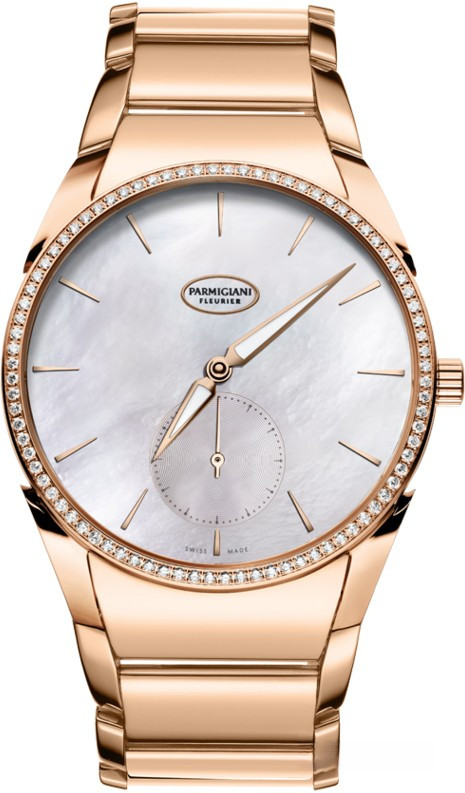 Женские наручные часы выпущены в корпусе из розового золота 18к рамером 39 х 8.4 мм и водонепроницаемостью до 30 метров. Сапфировое стекло с антибликовым покрытием установлено на лицевой стооне корпуса. Безель часов инкрустирован 84-ю белыми бриллиантами. На белом жемчужном циферблате отображаются часы, минуты и секунды. Малая секундная стрелка расположена на 6-ти часах. Часовая и минутная стрелки покрыты люминофором. Часы поставляются на ремешке из розового золота 18к.