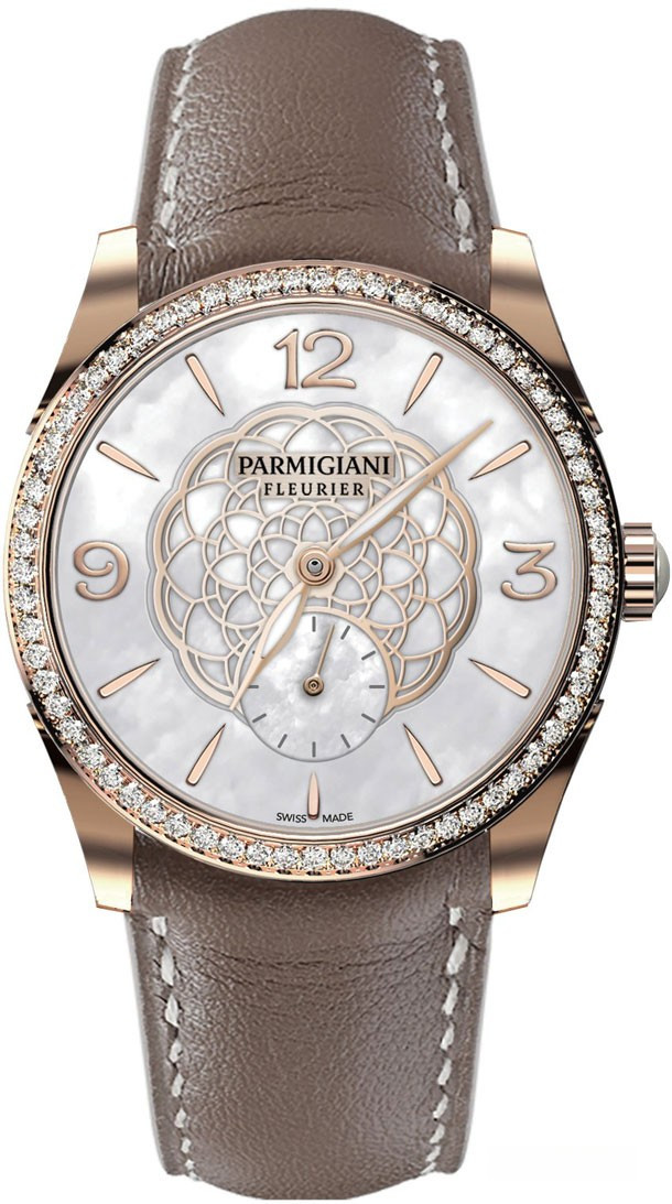 Часы Parmigiani Fleurier Tonda Metropolitane выпущены в корпусе из розового золота 18к размером 33.7 х 8.95 мм и водонепроницаемостью 30 м. Внутри корпуса установлен автоматический, Калибр PF330 с запасом хода 50 часов. На белом жемчужном циферблате отображаются часы, минуты, секунды. Часы комплектуются кожаным ремешком с вставкой из розового золота 18к. Безель из белых бриллиантов.