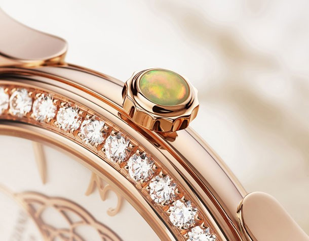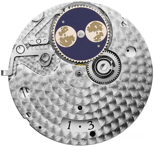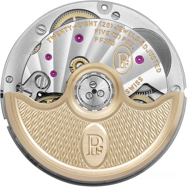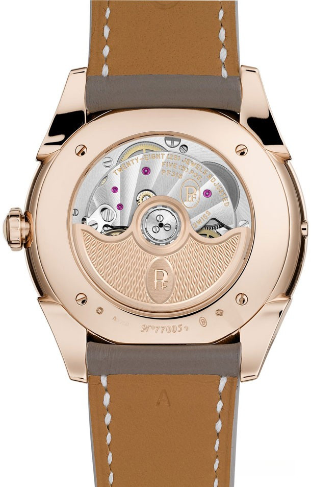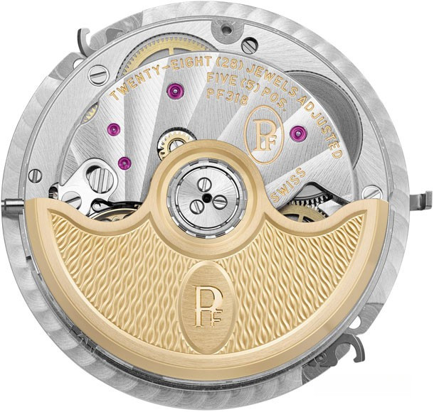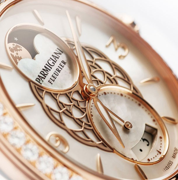 Часы Tonda Métropolitaine Sélène обладают потрясающим белым жемчужным циферблатом. По центру находится усложнение фазы Луны. Часовая и минутная стрелки скелетонированы. Корпус изготовлен из розового золота 18к. На 6-ти часах расположена маленькая секундная стрелка, вмещая в себя апертуру даты. Механизм PF318 и его модуль усложнения с фазой Луны были полностью созданы в стенах мануфактуры Parmigiani Fleurier. Корректор на 9 часах позволяет владельцу часов самостоятельно устанавливать фазу Луны по отношению к дню и дате, чтобы соответствовать ее фазе относительно географического местоположения. Механизм с автоподзаводом PF318 имеет запас хода 50 часов. Видимый сквозь заднюю крышку корпуса из сапфирового стекла механизм, полностью украшен узором Côtes de Genève, перлажем и имеет скошенные углы, соответствуя самым высоким стандартам часового искусства, традиционно применяемым на мануфактуре Parmigiani Fleurier. Безель из белых бриллиантов.