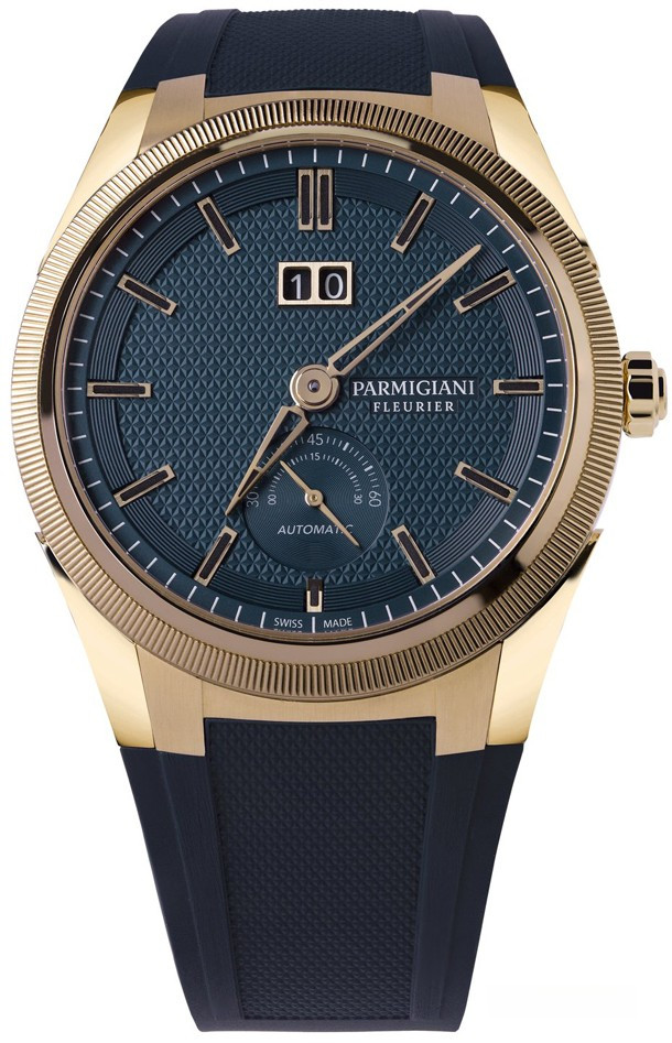 Часы Parmigiani Fleurier Tonda Automatic Big Date выпущены в корпусе из розового золота 18к размером 42 х 11.2 мм и водонепроницаемостью 100 м. Внутри корпуса установлен автоматический механизм, Калибр PF044, обладающий запасом хода 45 часов. На синем гильошированном циферблате отображаются часы, минуты, секунды, дата. Часы комплектуются каучуковым ремешком с вставкой из розового золота 18к. Часы выпущены ограниченной серией 150 шт.