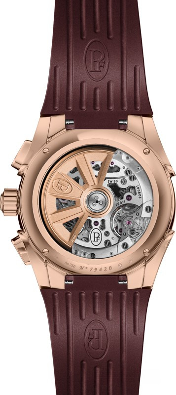 Часы Parmigiani Fleurier Tonda GT Chronograph представлены в корпусе из розового 18к золота размером 42 х 14.3 мм водонепроницаемостью 100 метров. Внутри корпуса установлен автоматический механизм, Калибр PF071, обладающий запасом хода 65 часов. На серебристом циферблате отображаются часы, минуты, секунды, дата, накопители хронографа. Часы комплектуются каучуковым ремешком с золотой застежкой.