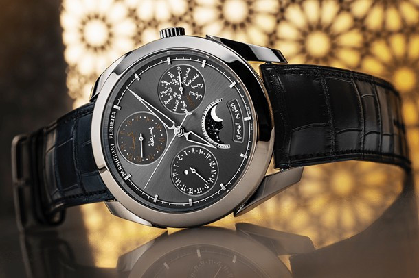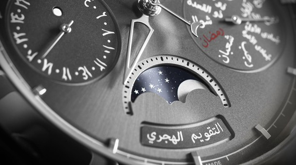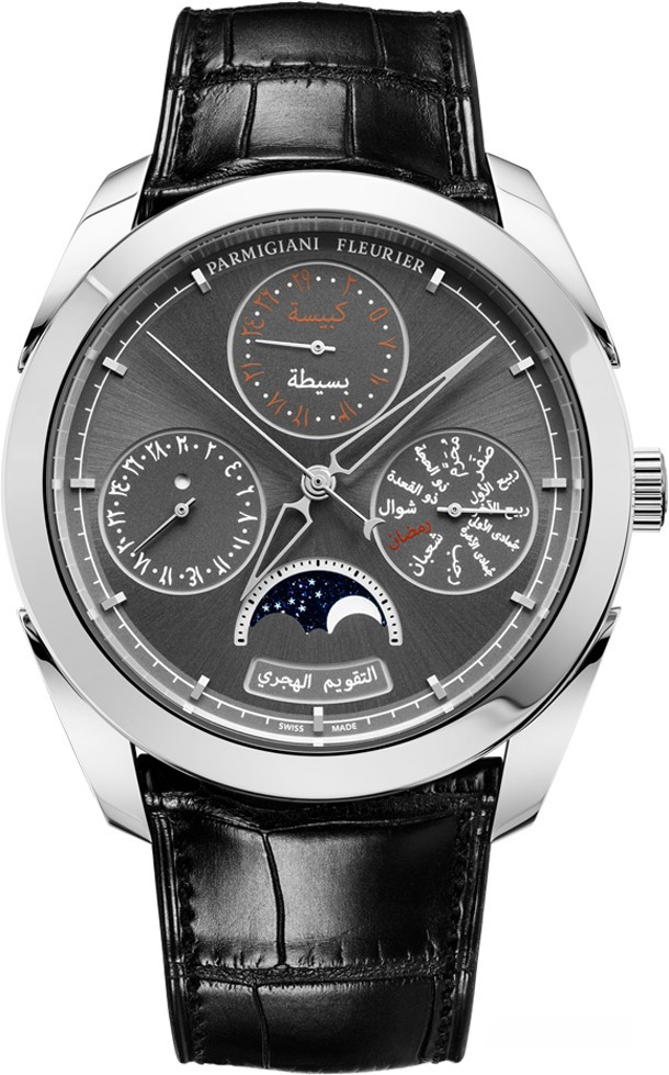 Часы Parmigiani Fleurier Hijri Perpetual Calendar - это вечный календарь хиджри с арабскими цифрами и надписями. Корпус размером 44.5 х 14.09 мм изготовлен из платины 950. Водонепроницаемость корпуса составляет 30 метров. На сером циферблате отображаются часы, минуты, секунды, запас хода, дата, день недели, месяц, фаза луны. Внутри корпуса установлен автоматический механизм, Калибр PF009, обладающий запасом хода 48 часов. Часы поставляются на ремешке из кожи аллигатора с платиновой вставкой. Серия ограничена - 40 шт.