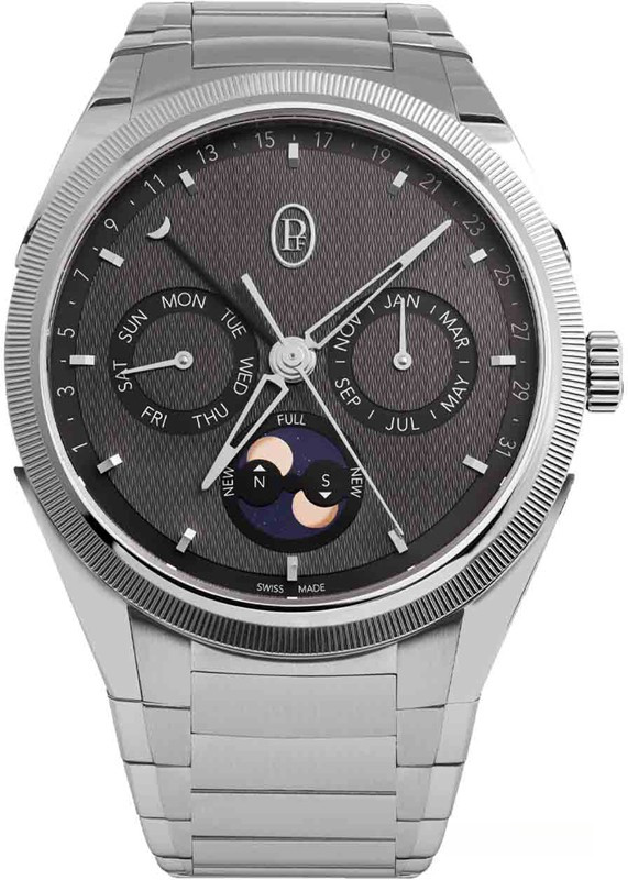 Часы Parmigiani Fleurier Tonda PF Annual Calendar представлены в корпусе из нержавеющей стали размером 42 х 11.1 мм водонепроницаемостью 100 метров. Внутри корпуса установлен автоматический механизм, Калибр PF339, обладающий запасом хода 50 часов. На сером гильошированном циферблате отображаются часы, минуты, секунды, дата, день недели, месяц, фаза луны. Часы поставляются на браслете из нержавеющей стали.