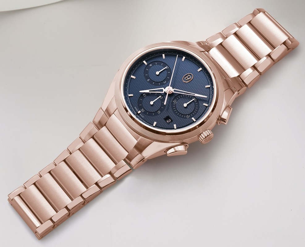 Часы Parmigiani Fleurier Tonda PF Annual Calendar представлены в корпусе из розового золота 18к размером 42 х 11.1 мм водонепроницаемостью 100 метров. Внутри корпуса установлен автоматический механизм, Калибр PF339, обладающий запасом хода 50 часов. На сером гильошированном циферблате отображаются часы, минуты, секунды, дата, день недели, месяц, фаза луны. Часы поставляются на браслете из розового золота 18к.