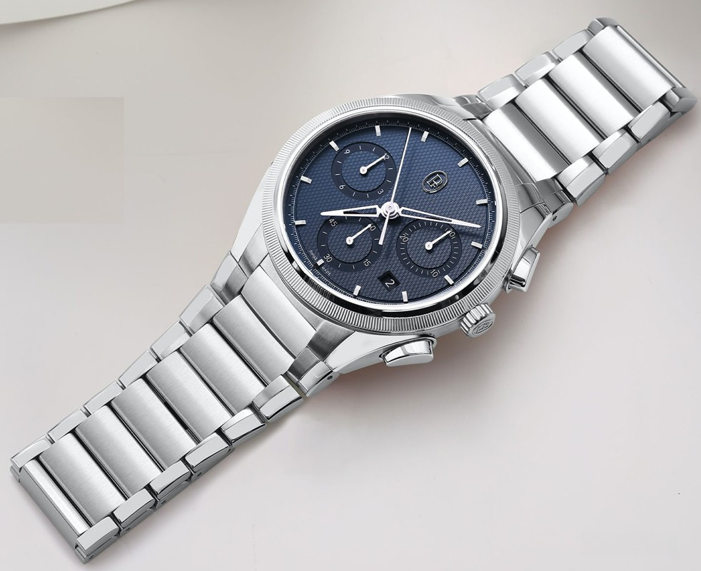 Часы Parmigiani Fleurier Tonda PF Chronograph представлены в корпусе из нержавеющей стали размером 42 х 12.4 мм водонепроницаемостью 100 метров. Внутри корпуса установлен автоматический механизм, Калибр PF070, обладающий запасом хода 65 часов. На синем гильошированном циферблате отображаются часы, минуты, секунды, дата. Часы поставляются на браслете из нержавеющей стали.